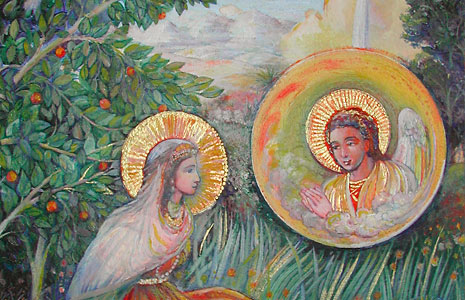 The main inspiration for Grahams Icon paintings obviously comes from Christian religious art traditions and artists such as Andrei Rublev. However there is a strong parallel between the Icons and the Indian miniatures, both in composition, perspective and materials. In the Icons a large-scale use of gold leaf is generally employed, but also a delightful and delicate use of faceted glass beads. This application of stones for a rich thee dimensional effect is often found in the Indian traditions of Rajasthani & Tanjore paintings. This crossover of cultures creates exiting new scope and dimension to the timeless nature of the Icons.